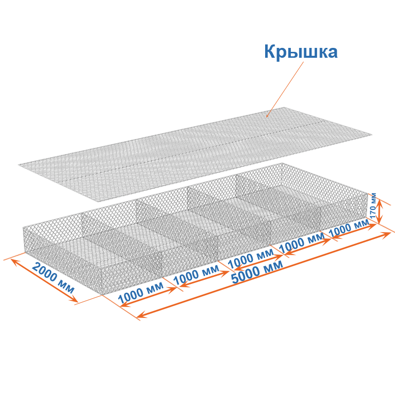 Пример применения: укрепление откосов и русел на типовых участках; заполнение камнем фракции крупнее 80х100, фиксация крышек и кромок после выверки отметок.